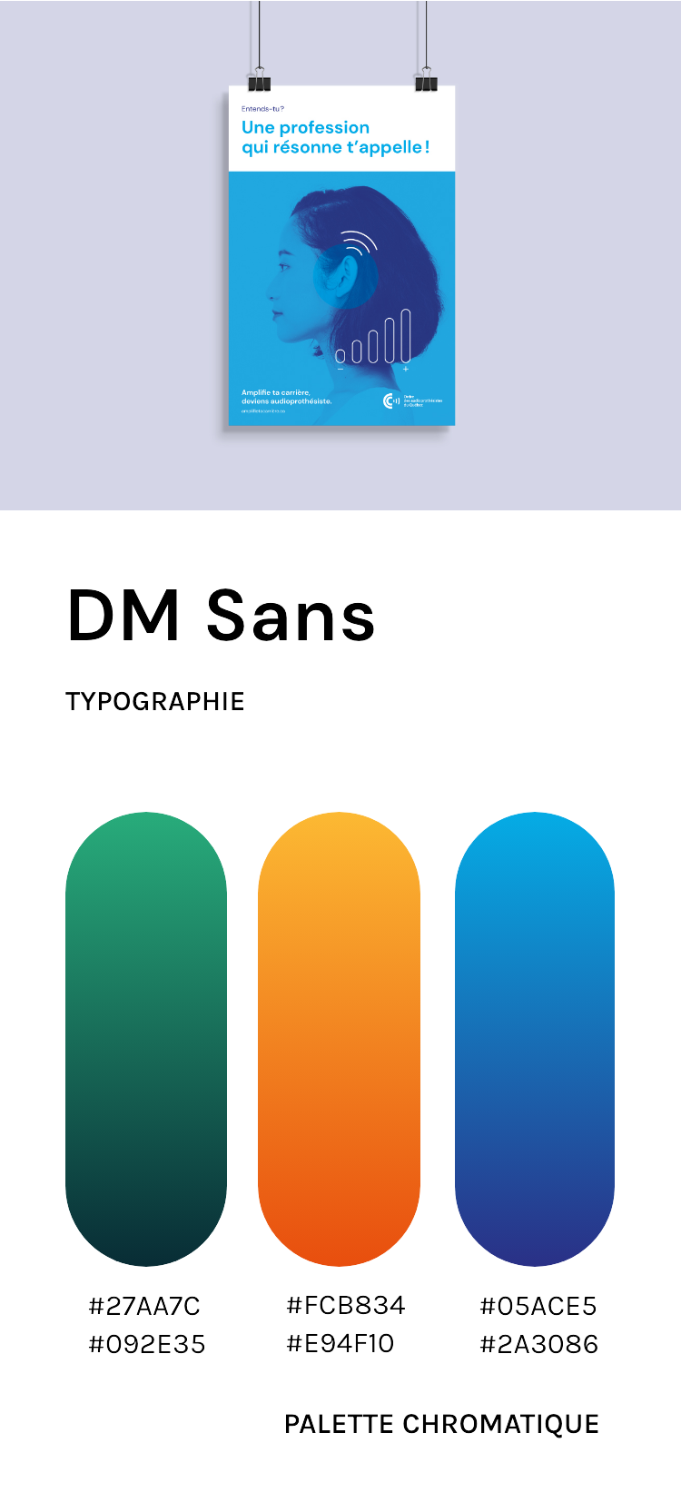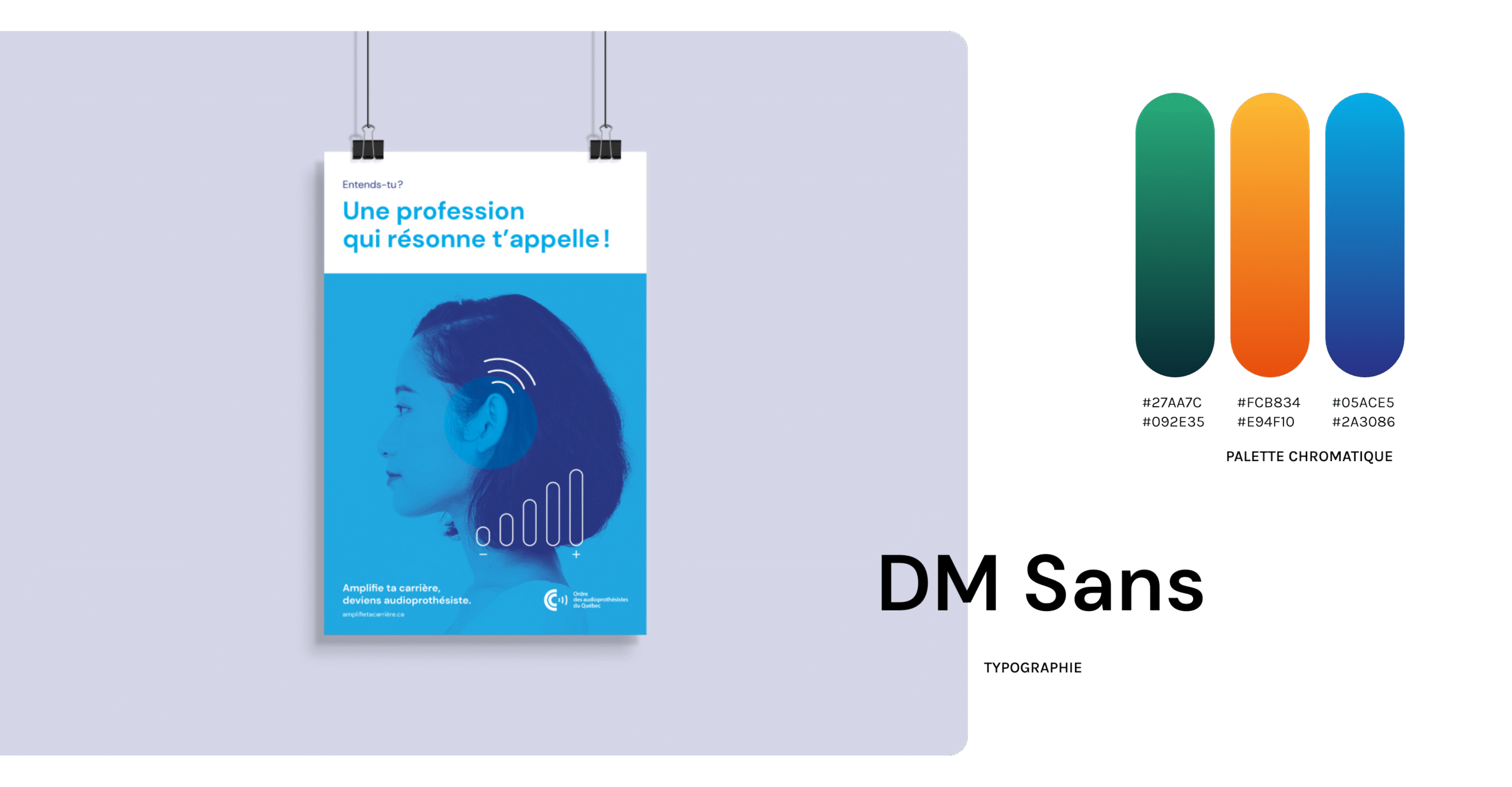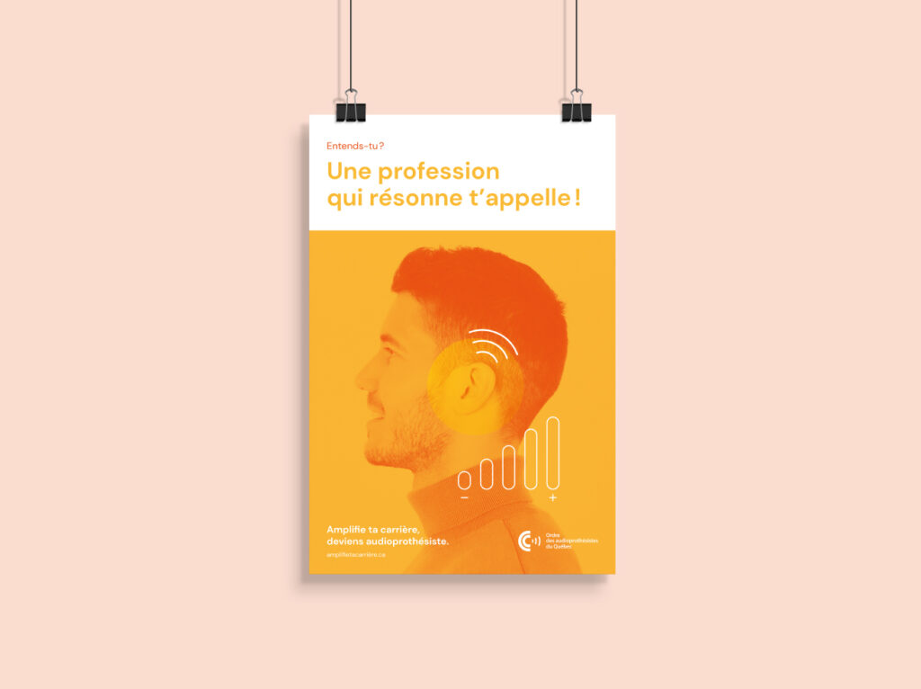 Développée en collaboration avec Morin Relations Publiques, la campagne Amplifie ta carrière! vise à faire rayonner la profession d’audioprothésiste et à stimuler le recrutement d’étudiantes et d’étudiants vers le programme collégial menant à cette carrière spécialisée. Mandatée par l’Ordre des audioprothésistes du Québec, notre équipe a conçu l’identité visuelle complète de la campagne ainsi que le site Web dédié amplifietacarriere.ca.