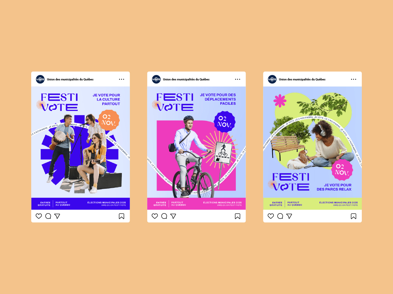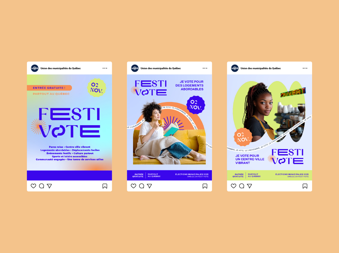 L’identité visuelle et les contenus de la campagne misent sur des codes graphiques dynamiques, colorés et actuels, déclinés sur les plateformes privilégiées par le public cible. Des collaborations avec des créatrices de contenu et une présence multiplateforme (Instagram, TikTok, YouTube, Spotify) ont permis d’amplifier la portée du message à l’échelle du Québec. Festi-Vote illustre comment la communication créative peut devenir un puissant levier d’engagement citoyen.
