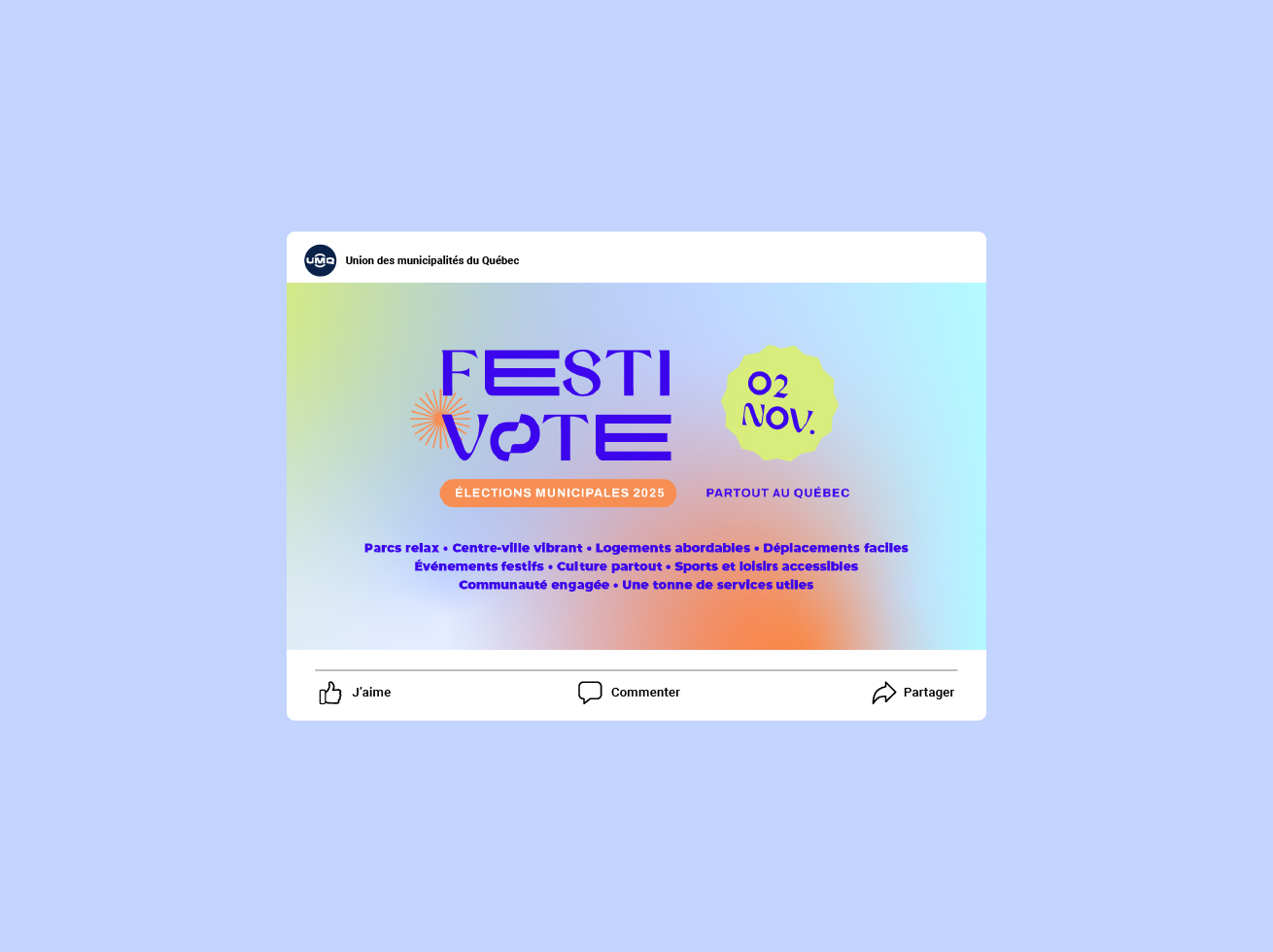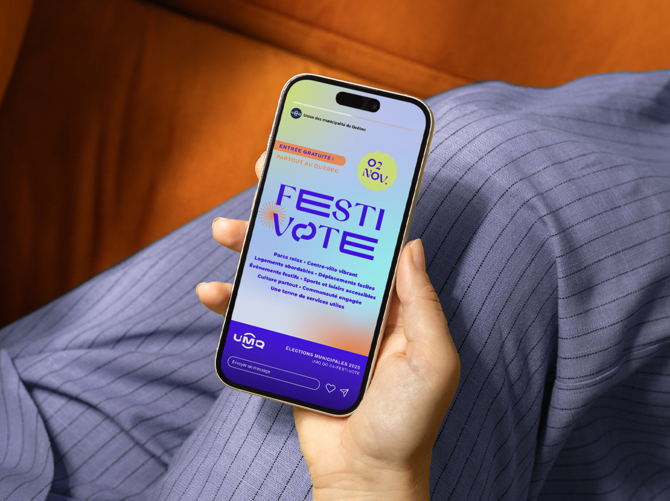 En vue des élections municipales de 2025, Duval Design a collaboré avec Morin Relations Publiques et l’Union des municipalités du Québec (UMQ) à la conception et au déploiement de la campagne Festi-Vote, une initiative audacieuse visant à stimuler la participation électorale des jeunes adultes de 18 à 35 ans.