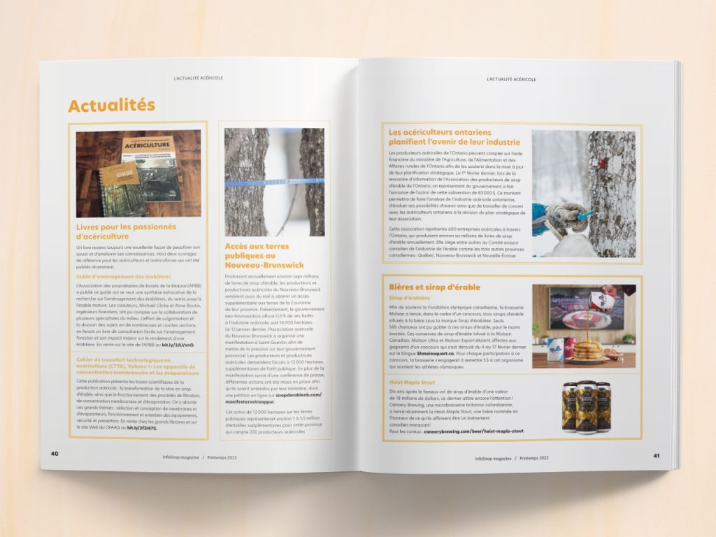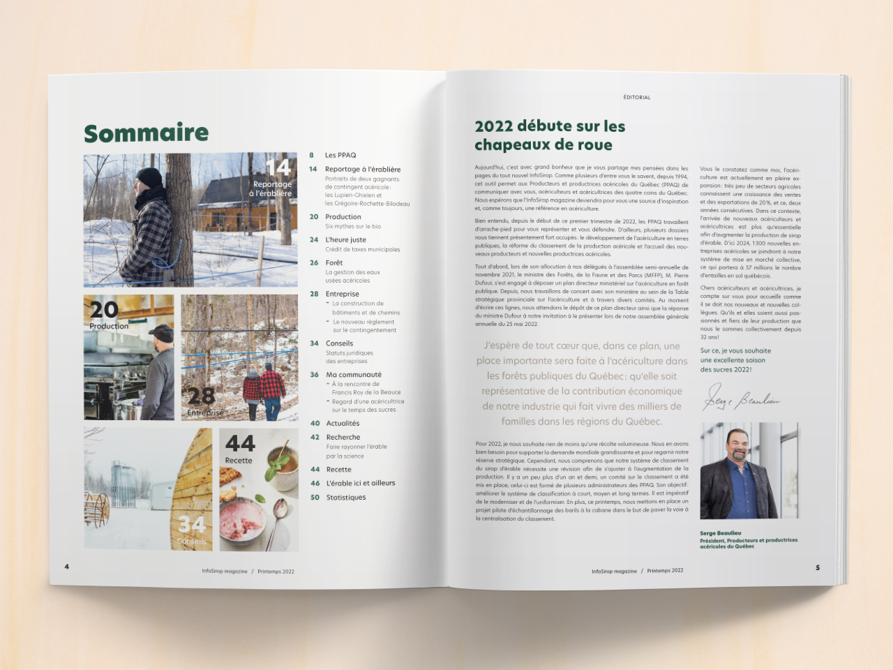 Le nouveau magazine remplace le traditionnel bulletin informatif qui était distribué aux membres depuis 1994. « Comme plusieurs d’entre vous le savent, depuis 1994, cet outil permet aux producteurs et productrices acéricoles du Québec (PPAQ) de communiquer avec vous, acériculteurs et acéricultrices des quatre coins du Québec. On espère que l’InfoSirop Magazine deviendra pour les lecteurs une source d’inspiration et, comme toujours, une référence en acériculture. » Serge Beaulieu, président.